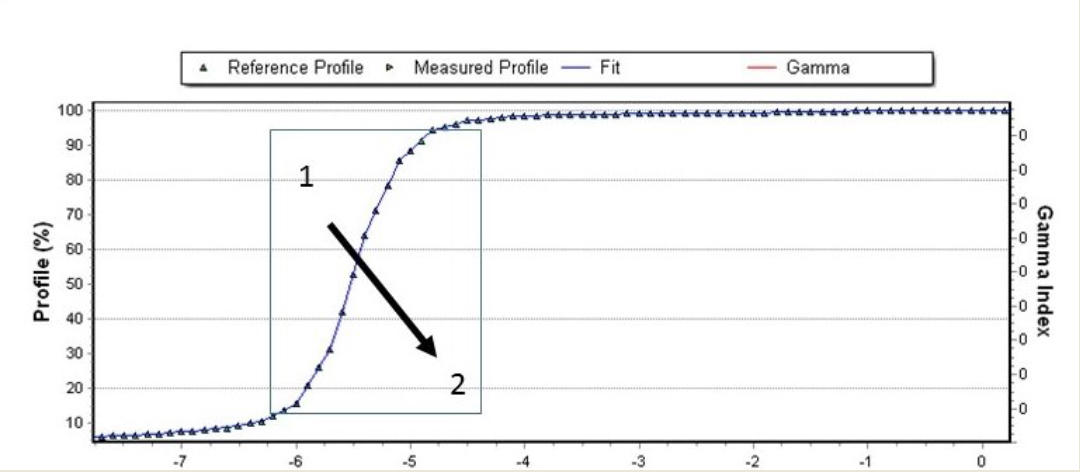 attempts to align measurement profile/pdd against the reference dataset. The program will try to find the minimum square relative difference between both datasets. The search area for the minimum is between 80 and 30% of the profile/pdd.