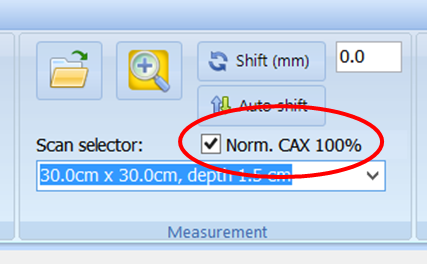 1. By default all profiles are normalized to 100% at central axis (CAX) during the import process. If the user prefers to display original data instead, "Norm. CAX 100%" option has to be unchecked.