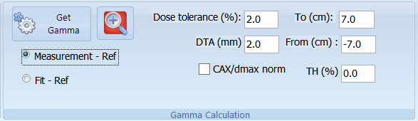 1. There are two types of gamma calculations that can be performed with the program. The first one is a gamma calculation of the reference dataset against fitting curve. This is specified when the user checks "Fit-Ref" box. The second gamma calculation can be performed between measurements and fitting curve. This is specified by checking “Measurement-Ref” box. The user needs to select first the type of calculation in order to enable the “Get Gamma” button